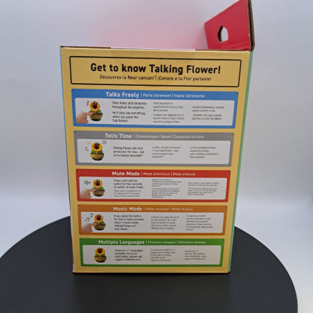 La flor parlante te dirá frases acordes al momento del día, detectará la temperatura que hace a su alrededor, te avisará si se está quedando sin pilas e incluso te dirá qué hora es. Si mantienes pulsado el botón, ¡te deleitará con un «¡Qué maravilla!» y empezará a sonar música!