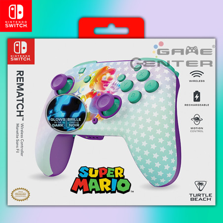 El Turtle Beach Rematch Wireless Controller – Mario Invencible es un control inalámbrico oficial diseñado para Nintendo Switch™, Switch Lite, Switch OLED y Nintendo Switch 2 (el botón C no está disponible en este modelo). Su diseño vibrante inspirado en Mario con la icónica Estrella de Invencibilidad aporta energía y estilo a cada partida, además de brillar en la oscuridad tras la exposición a la luz. Incorpora sensor de movimiento integrado para una experiencia más inmersiva en títulos como Mario Kart 8 Deluxe, Mario Kart World o Donkey Kong Bananza.