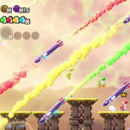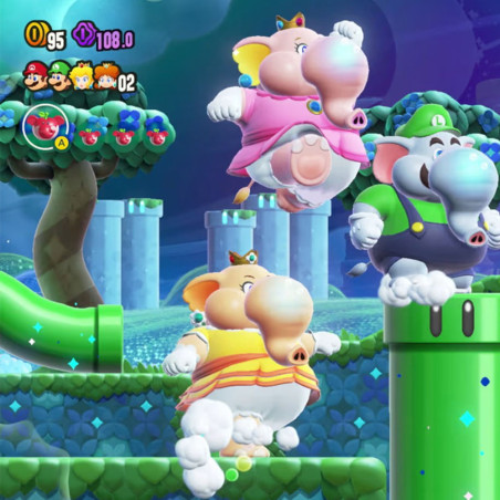 - Elige entre personajes conocidos como Mario, Luigi, Peach, Daisy, Yoshi y Toad. ¡Utiliza una nueva transformación y conviértete en Mario Elefante para usar tu trompa y derrotar enemigos de manera inesperada!